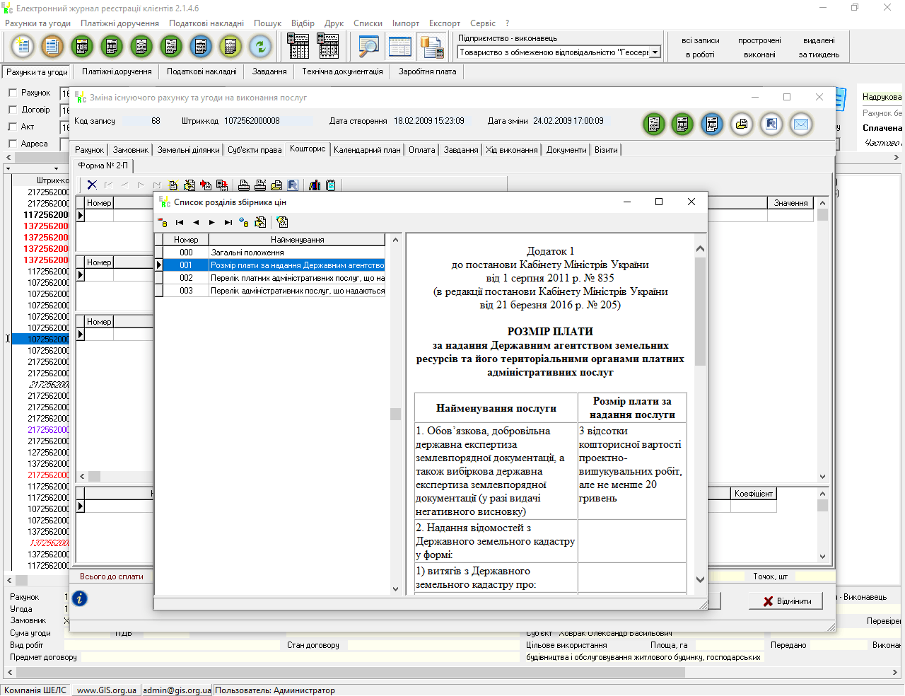 Реєстр складається з бази даних рахунків, договорів та актів на виконання земельно-кадастрових робіт, бази платіжних доручень, бази податкових накладних і модулю розрахунку кошторисів. Створення рахунків може виконуватися в ручному режимі або автоматично з програми Геодезична Інформаційна Система 6.